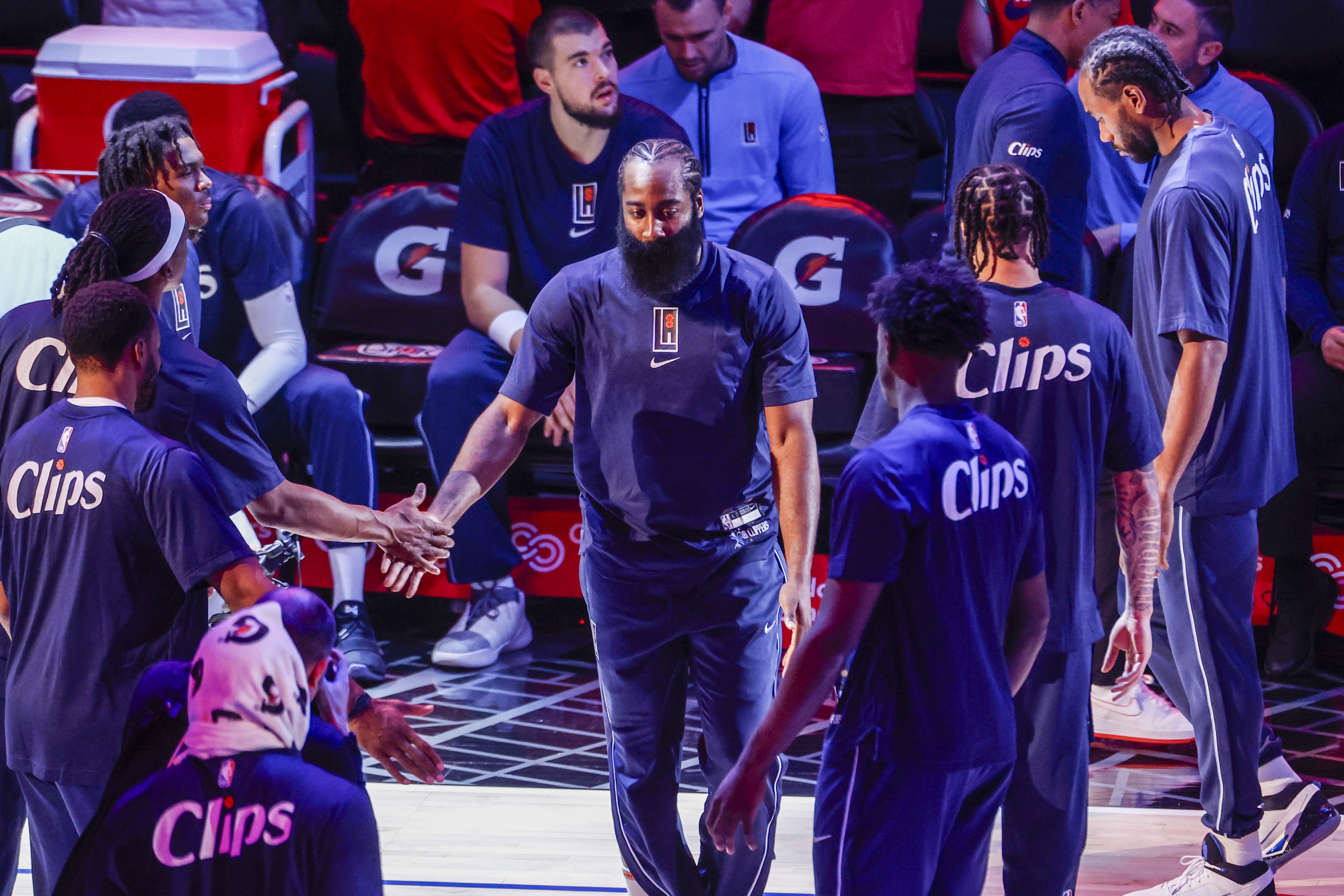 与当时的76人总裁闹出不愉快后,哈登在23-24赛季登陆空接之城,与伦纳德和保罗·乔治组成新三巨头。
